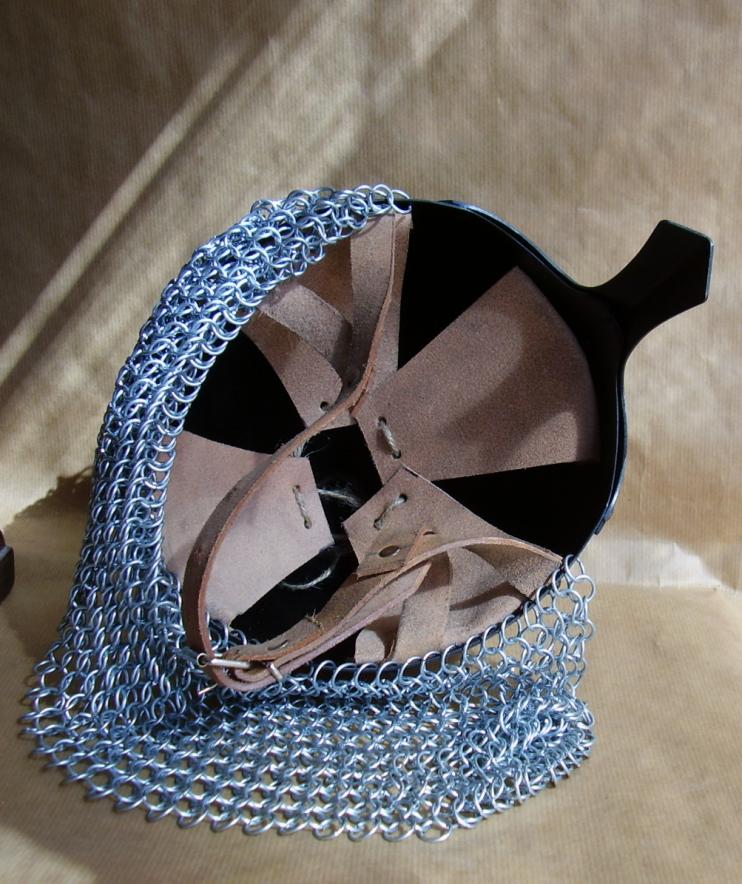 Elmo Normanno a nasale provvisto di maglia ad anelli di ferro (anelli zincati) per proteggere la parte posteriore del collo.