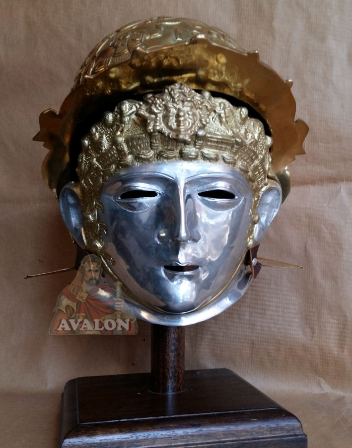 Elmo romano Ribchester realizzato interamente in metallo ottonato lavorato a mano, stagno fuso e sbalzato la maschera.