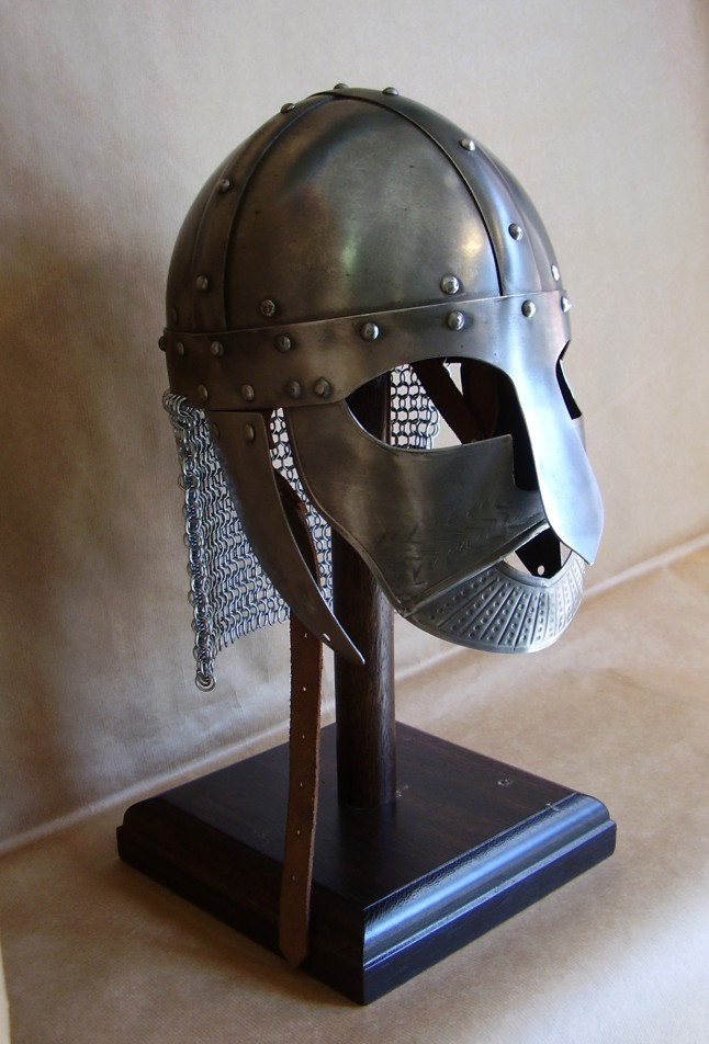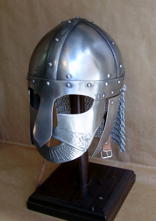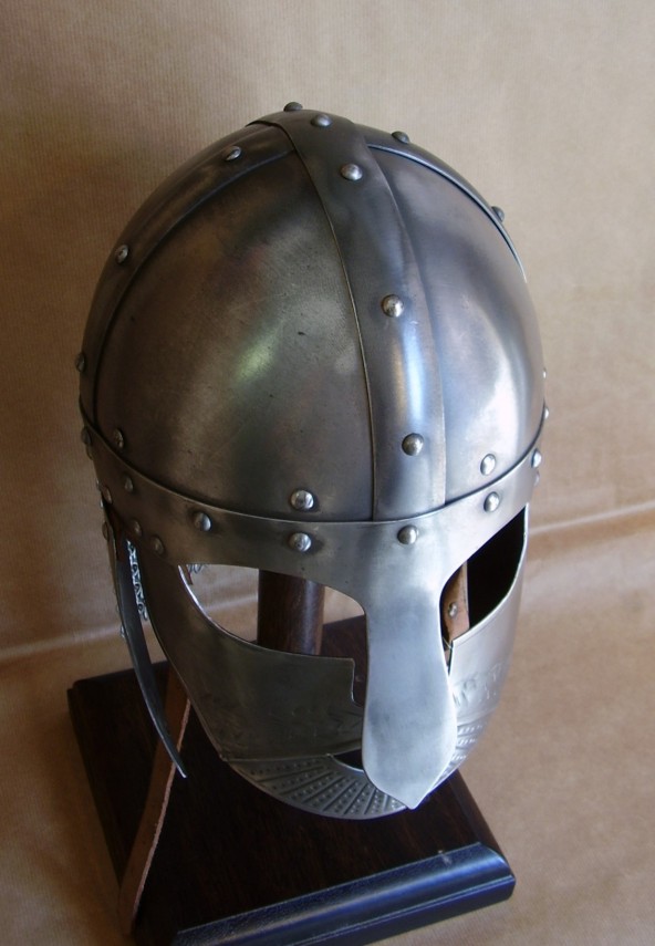 Elmo Vichingo - Normanno semisferica, con maschera facciale in metallo a protezione degli occhi e del naso ma anche per includere la paura all'avversario, realizzato in acciaio lavorato a mano con l'applicazione di un camaglio, calotta di cuoio regolabile per migliorarne la comodità, inoltre tutte le parti in metallo sono rivestite internamente in cuoio. Elmo di origine nordica, diffuso in seguito in tutta l'Europa occidentale tra le fanterie fino alla metà del XIV secolo. Elmo normanno, elmo che trae origini dal "Vendelhelm" diffuso in Europa occidentale dalle incursioni dei Vichinghi. Dal Vendelhelm vennero sviluppati, intorno all'Anno Mille, l'elmo normanno o elmo a nasale e l'elmo mezza maschera. L'interno dell'elmo presenta una cuffia in cuoio regolabile per essere indossato, l'elmo ha una sottogola in cuoio e fibbia in ottone. Dettagli: