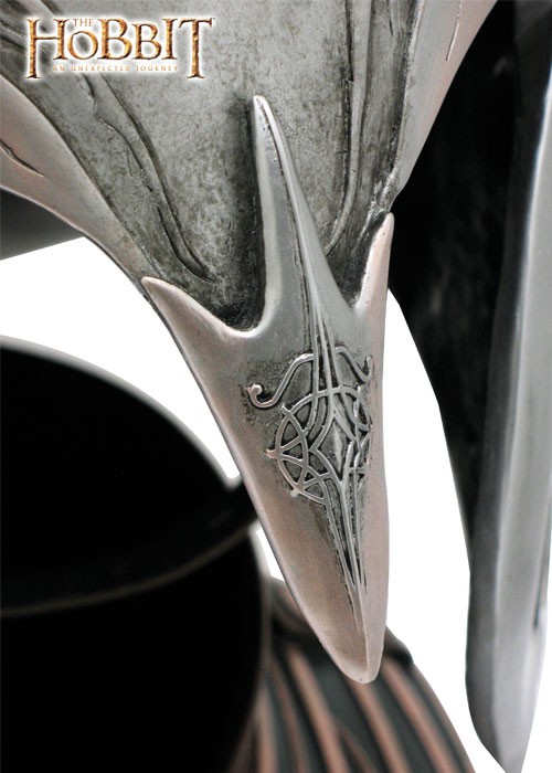 Riproduzione dell'Elmo elfico di Rivendell. Questa replica autenticamente dettagliata è una riproduzione esatta dell'elmo utilizzato nel film The Hobbit - Un Viaggio Inaspettato, ideato dalla Weta Workshop in Nuova Zelanda. Lavorazione manuale con decorazioni in rilievo. L'interno è rivestito in vera pelle.