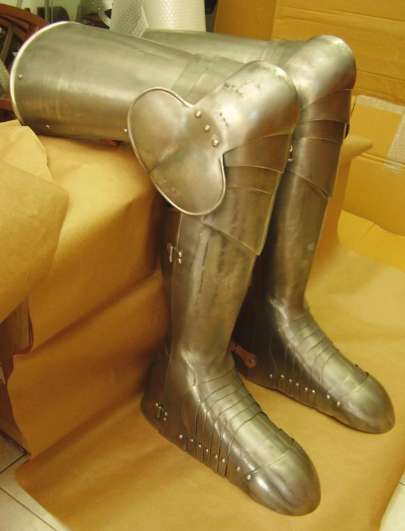 Completa di cosciale, ginocchietto con aletta, schiniere e scarpa. Realizzata in ferro spazzolato con coietti in pelle.