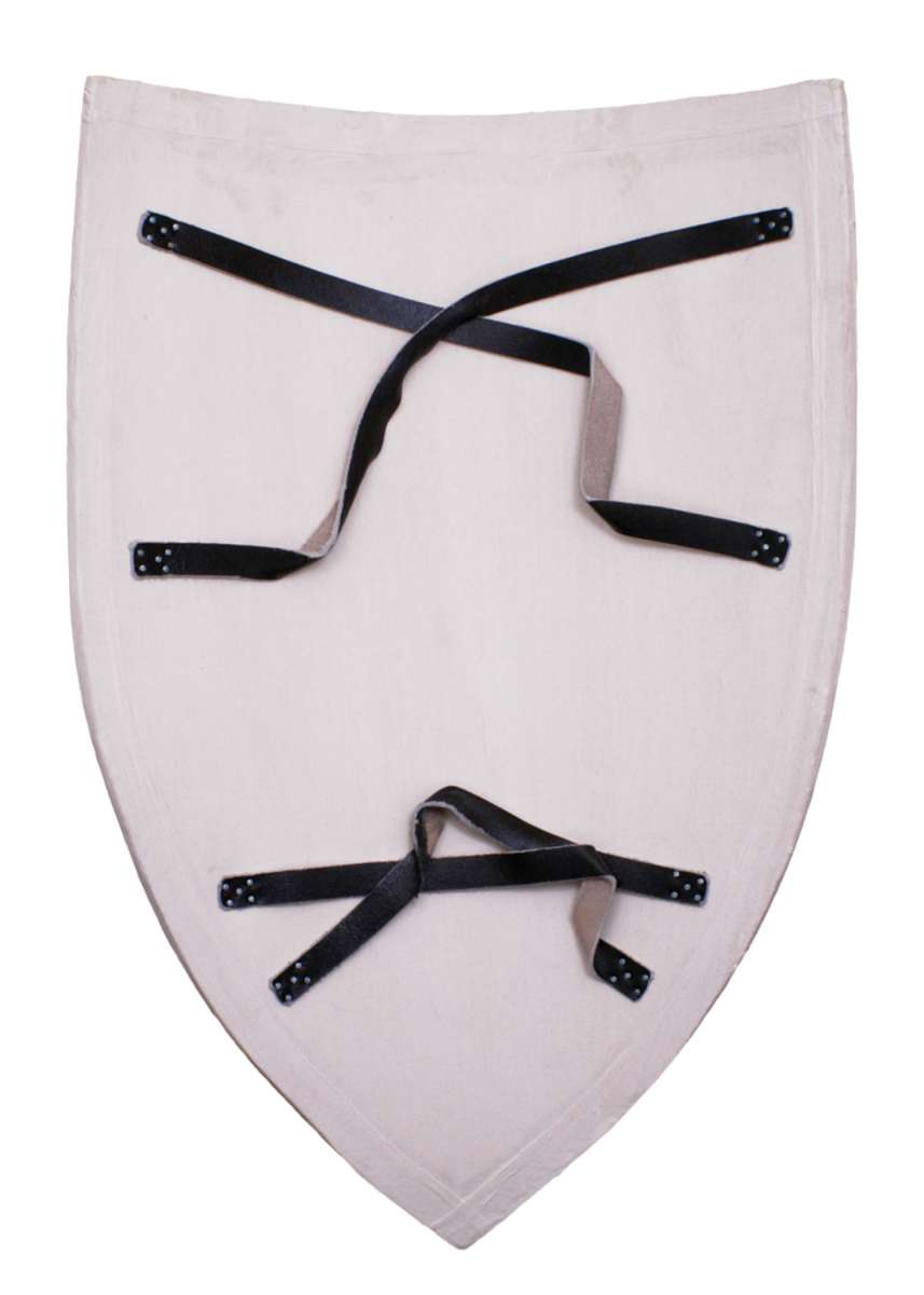 Scudo in legno grezzo, non verniciato.Questo scudo è dipinto solo di bianco, è perfetto per essere facilmente dipinto con lo stemma o i colori desiderati.Il retro è dotato di quattro cinturini in pelle, in modo che sia facilmente trasportabile e comodamente indossabile.
