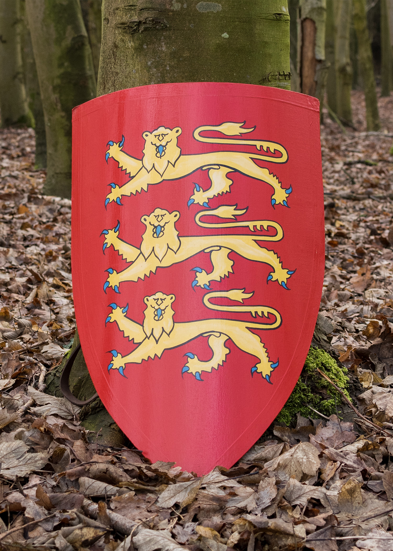 Lo scudo medievale che offriamo qui mostra lo stemma reale d'Inghilterra così come era usato dai monarchi inglesi nell'Alto Medioevo per un periodo di circa 170 anni (con brevi interruzioni). Consiste di tre leoni identici, che camminano - i cosiddetti leoni passants guardants - in oro con lingue e artigli blu, su uno sfondo cremisi.