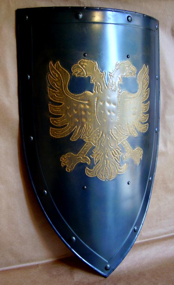 Scudo in uso nel Medioevo, con stemma aquila a due teste, interamente realizzata in ferro brunito lavorato a mano e figura cesellata e dorata.