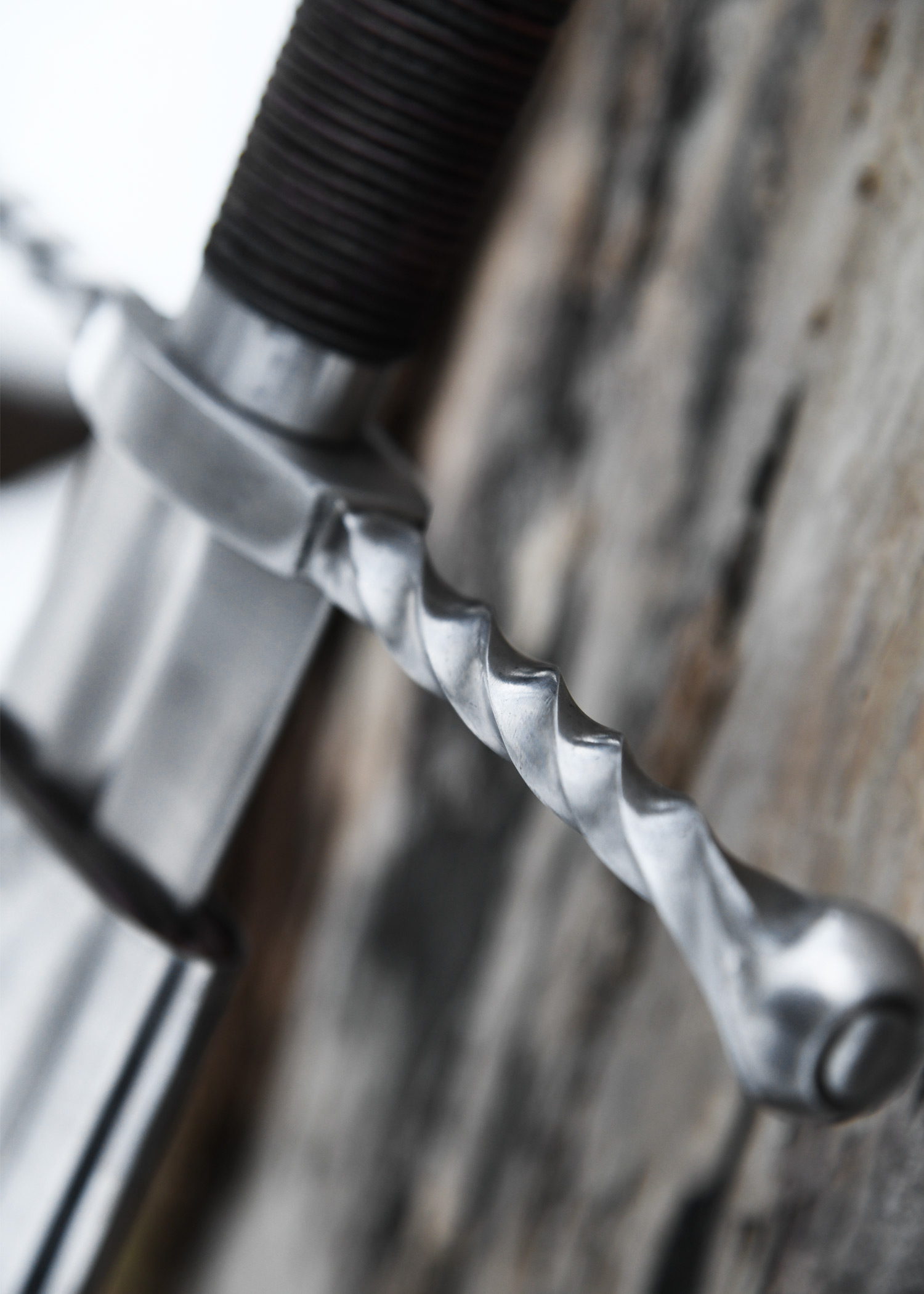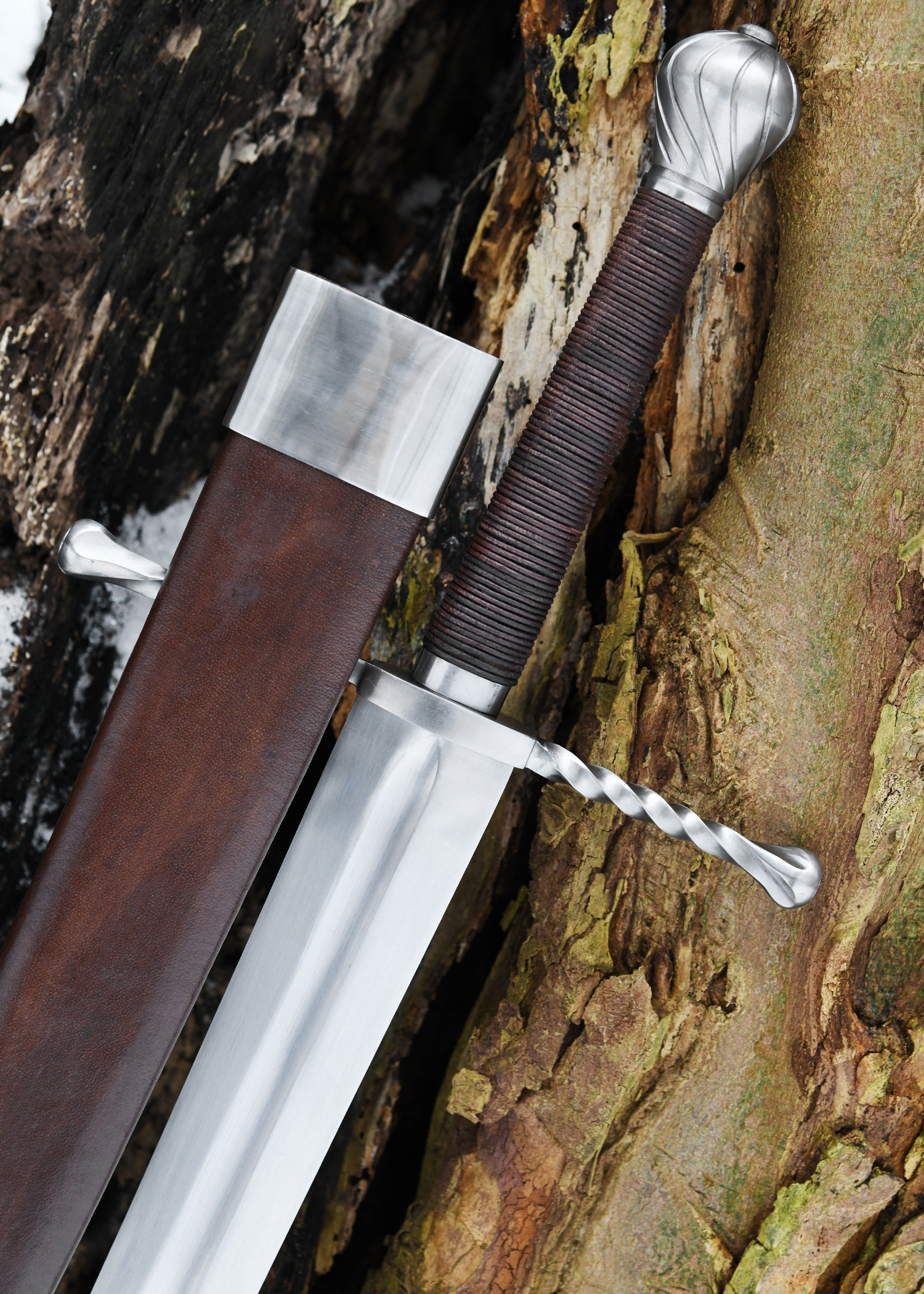 Questa ricostruzione è realizzata esclusivamente a mano. La protezione trasversale dritta e attorcigliata e il pomo sono in ghisa malleabile trattata termicamente. La lama in acciaio armonico EN45, passa attraverso il pomo e viene rivettata a mano. Il manico è avvolto da cinturino in pelle. La lama ha un pronunciato più pieno che arriva quasi a metà lama e conferisce alla spada maggiore elasticità e leggerezza allo stesso tempo.