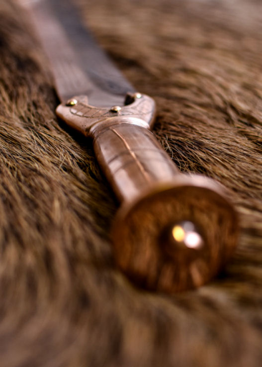 Questa replica di una spada corta celtica dell'età del bronzo è molto dettagliata. Si compone di due parti, il manico e la lama. Entrambi sono fusi in bronzo e rivettati insieme. La lama ha incisioni.
