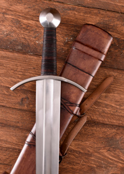 Replica di una spada altomedievale a una mano con un tipico pomo a disco, che ha un bordo a gradini a forma di lacrima. Questo tipo di spada era già utilizzato dai Normanni e poco dopo fu impiegato nelle Crociate per liberare la Terra Santa.