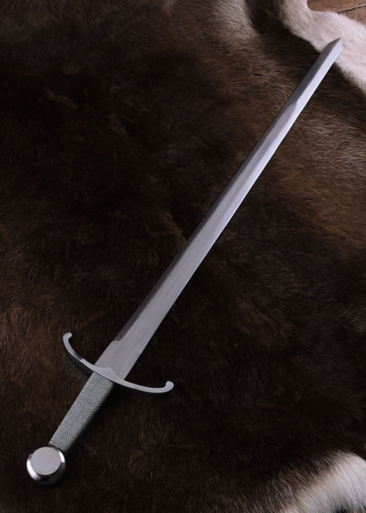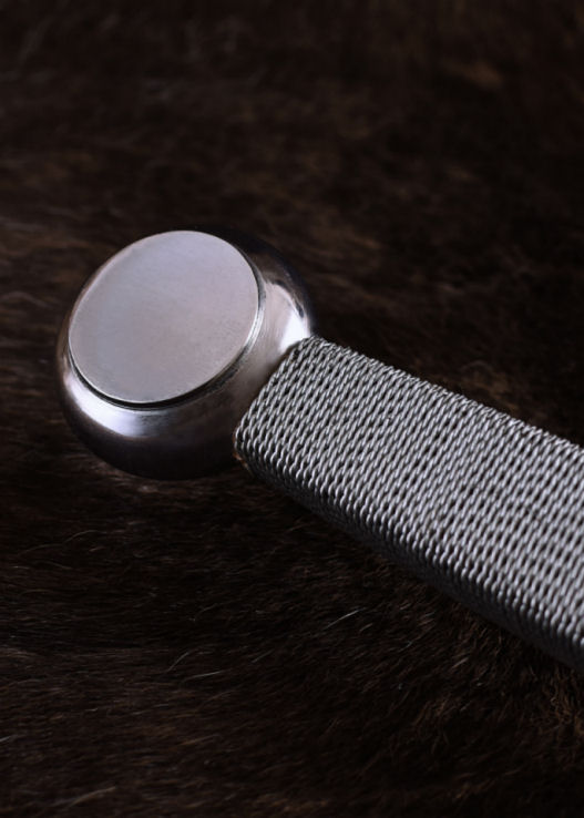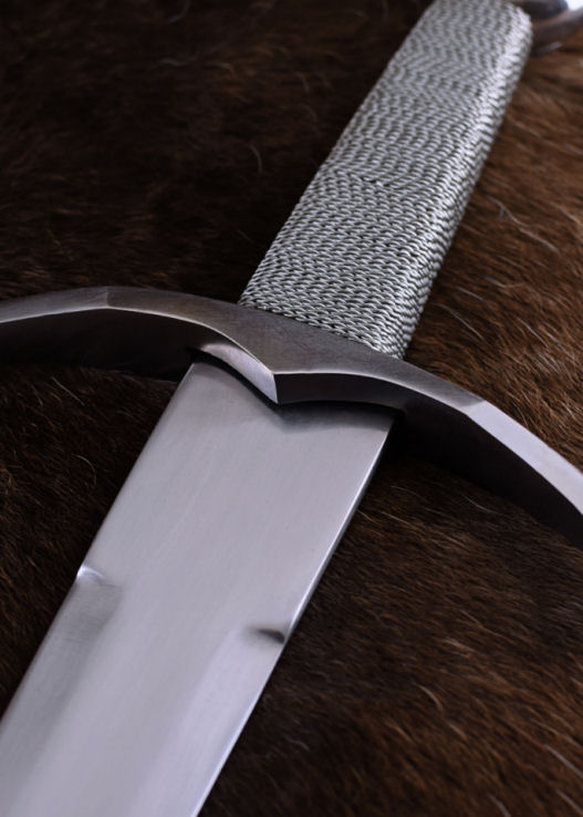La lama in acciaio al carbonio non affilata di questa bellissima spada è forgiata fino al pomo e doppiamente imbullonata all'estremità del manico. Il manico era avvolto in fil di ferro nel modo tipico e dotato di un classico pomo a disco. La guardia della nostra spada medievale a una mano è leggermente piegata verso il basso.