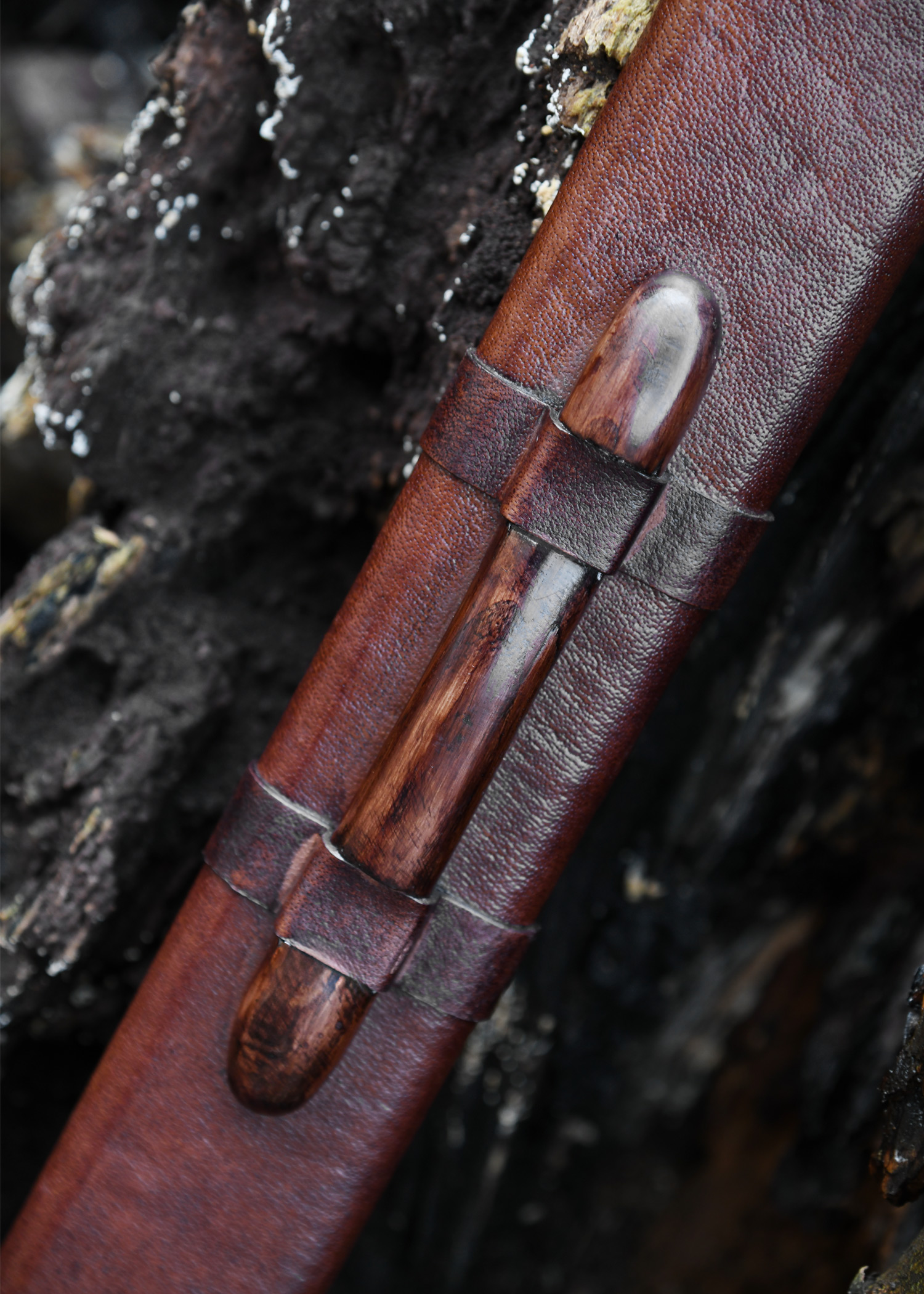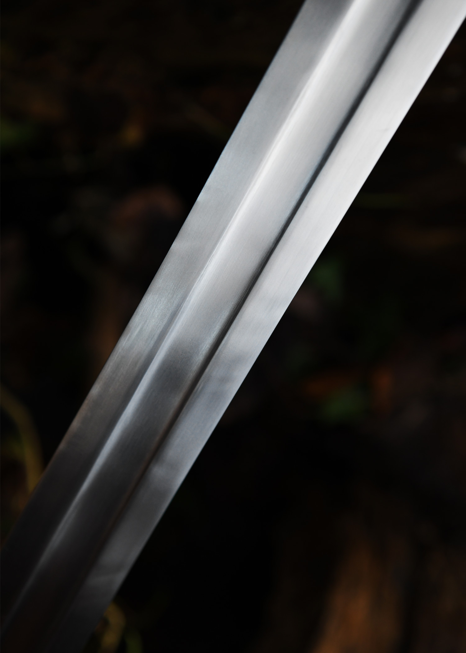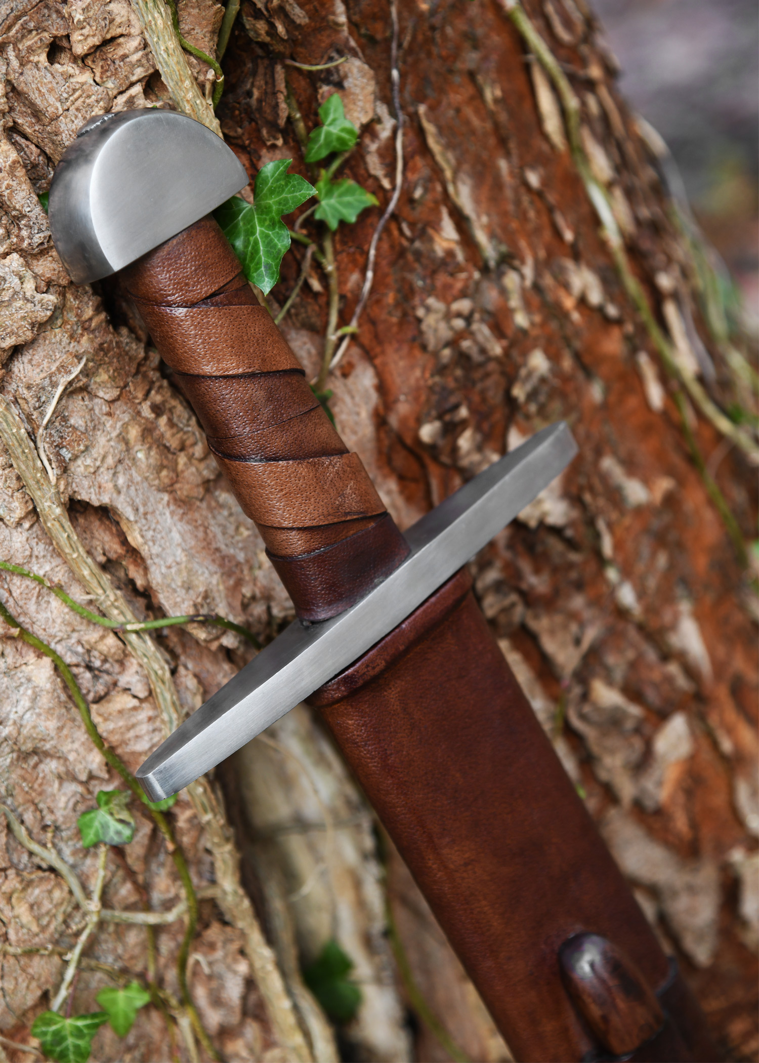 Spada Normanna esclusivamente artigianale. La protezione e il caratteristico pomo sono realizzati in ghisa malleabile termotrattata. La lama in acciaio per molle è temperata ad olio fino a 48-50° Rockwell e rivettata a mano al pomo. L'elsa è fasciata in pelle. La lama ha un caratteristico fuller che offre sia una grande flessibilità che un peso inferiore. I bordi della lama sono smussati e la punta è arrotondata per sicurezza.