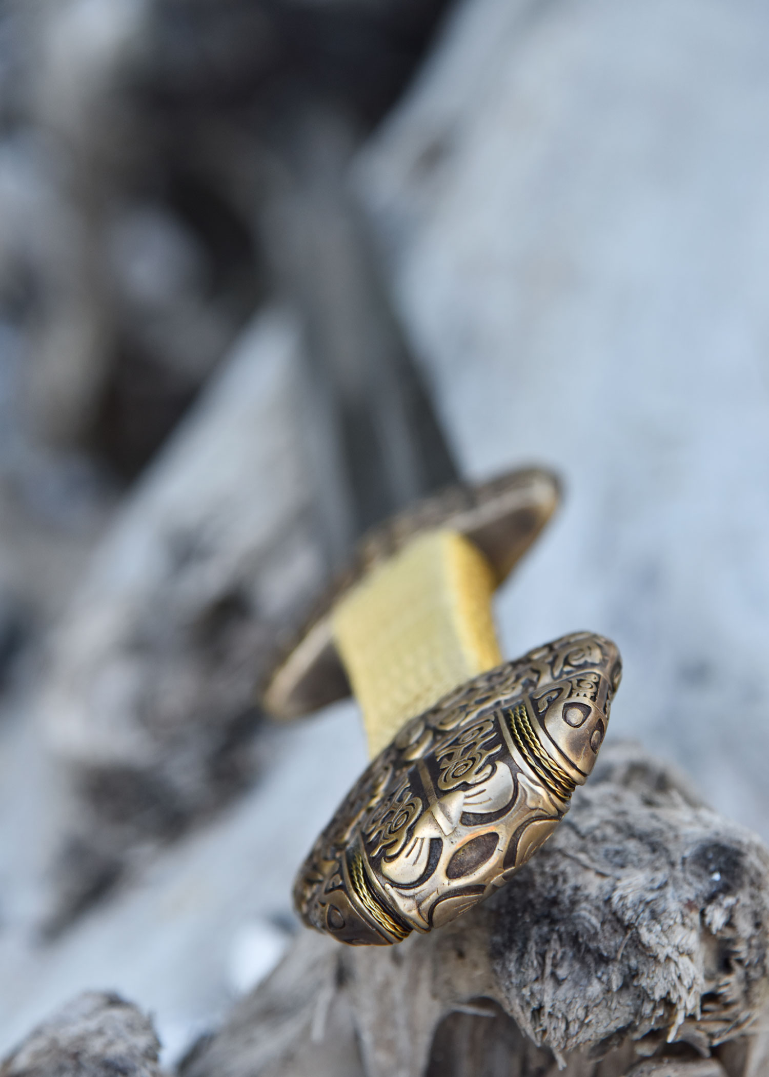 L'elsa è composta da una corta guardia in ottone, un'impugnatura in legno strettamente avvolta in filo di ottone e un pomello in ottone di dimensioni generose. Anche qui, la guardia e il pomo ricreano fedelmente gli intricati motivi e motivi del manufatto originale. Proprio come molti esempi storici dell'epoca, il pomo della spada è una costruzione in due parti. Il codolo intero della lama è stato conficcato nella base, attraversa il cappuccio superiore ed è rivettato dall'alto. La base e il cappuccio sono fissati insieme per mezzo di due rivetti.