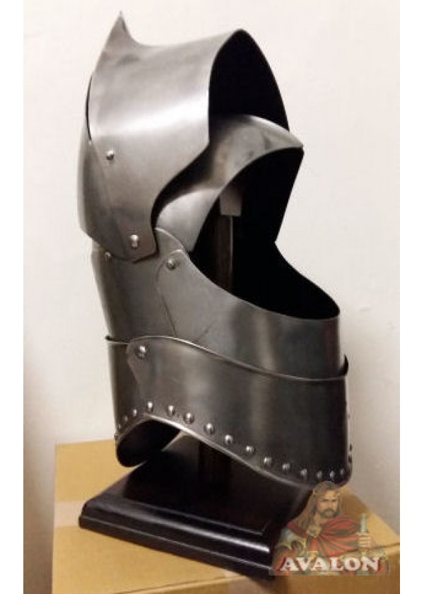 L'elmo a bocca di rana o Stechhelm che in tedesco significa "elmo da giostra" era un tipo di elmo di grandi dimensioni, apparso intorno al 1400 e durato fino al primo quarto del XVI secolo. L'elmo era utilizzato principalmente dai cavalieri a cavallo per i tornei (giostre) piuttosto che sul campo di battaglia. L'analogia con la bocca di una rana derivava dal modo in cui l'ocularium (la fessura attraverso la quale chi indossava l'elmo poteva vedere), assomigliava alla bocca aperta di una rana. Durante i tornei di giostra, l'elmo offriva un migliore grado di protezione dalle lance che si scheggiavano in seguito all'impatto con l'armatura del rivale. I primi esempi di stechhelm erano realizzati in un unico pezzo di metallo, mentre gli elmi più precedenti avevano strutture incernierate che potevano essere smontate. Apparso nel XV e XVI secolo in Germania, l'elmo divenne popolare grazie alle giostre medievali perchè garantiva un'incredibile protezione degli occhi e del collo. Una tecnica popolare nei tornei era quella di sollevare la testa all'ultimo secondo. Ciò oscurava completamente la vista di chi lo indossava, ma proteggeva gli occhi dalle schegge della lancia che si rompevano sull'armatura o sullo scudo; lo scenario più probabile era che la lancia si frantumasse in un punto qualsiasi sotto il collo. La nostra versione è realizzata manualmente da esperti fabbri e artigiani italiani, in acciaio al carbonio. La visiera può essere sollevata e bloccata con un perno. Insieme all'elmo viene fornita un'infula imbbottita per il massimo comfort. Questo elmo è ideale per il combattimento e buhurt per la massima protezione che offre, ma anche per parate di rievocazione storica medievale o giostre medievali. Elmo personalizzabile in dimensioni, finitura e spessore dell'acciaio(1mm - 1,2 mm - 1,5 mm - 2mm). Tempo di produzione 10 - 14 giorni lavorativi.