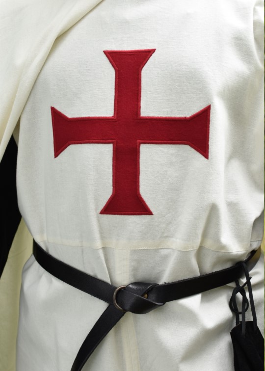 Questa tunica lunga fino al polpaccio è realizzata in cotone. Ha un taglio dritto e spacchi laterali fino alla vita. La parte anteriore e quella posteriore hanno anche uno spacco leggermente più corto al centro. La classica croce dei Templari è applicata sul petto.