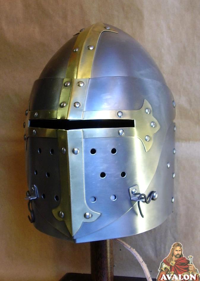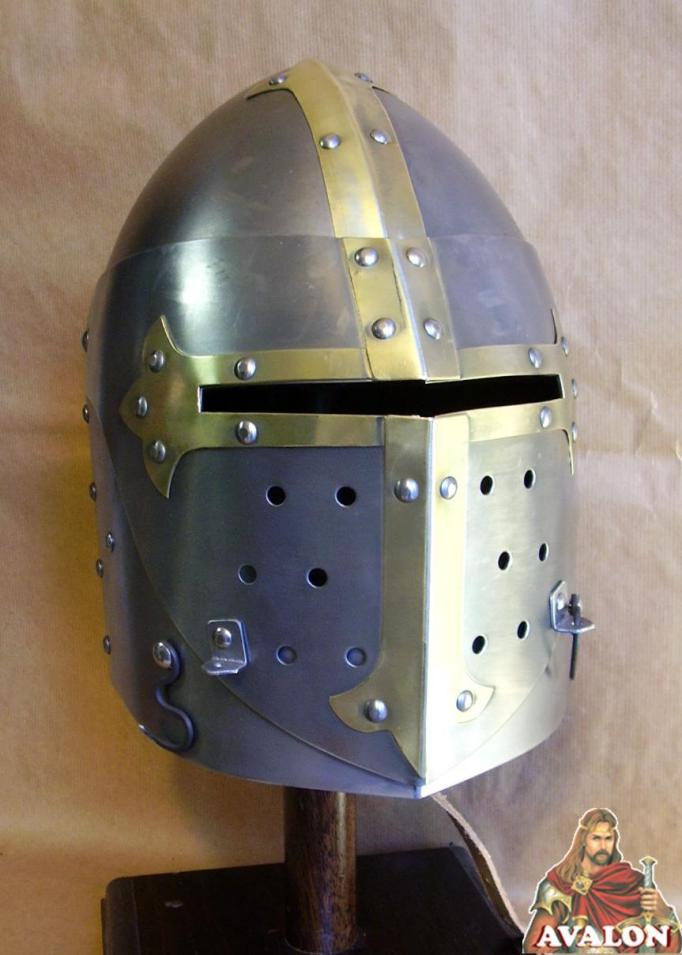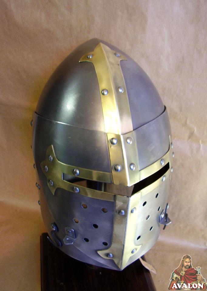 Ricostruzione autentica di un elmo Templare da combattimento, si tratta di un elmo a coppo ogivato con visiera.