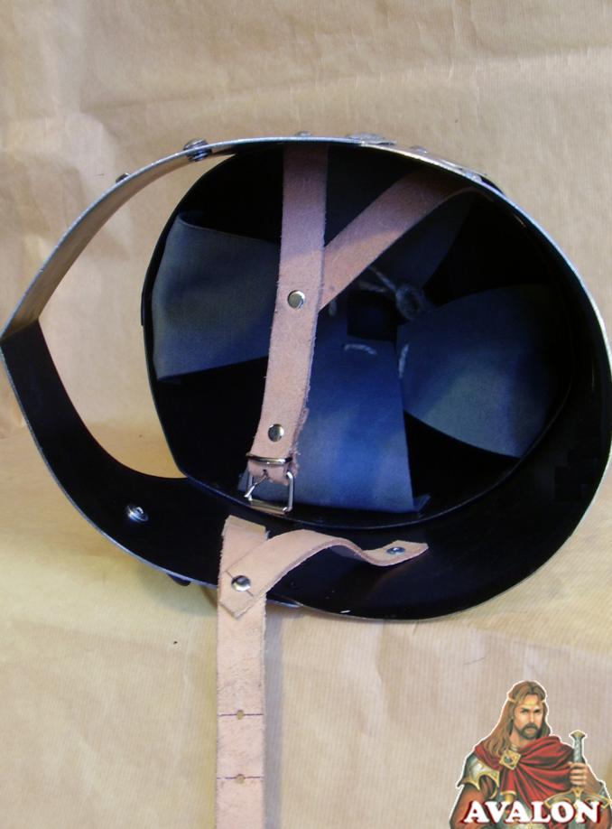 L'interno dell'elmo presenta una cuffia in cuoio regolabile per essere indossato, l'elmo ha una sottogola in cuoio e fibbia in ottone.