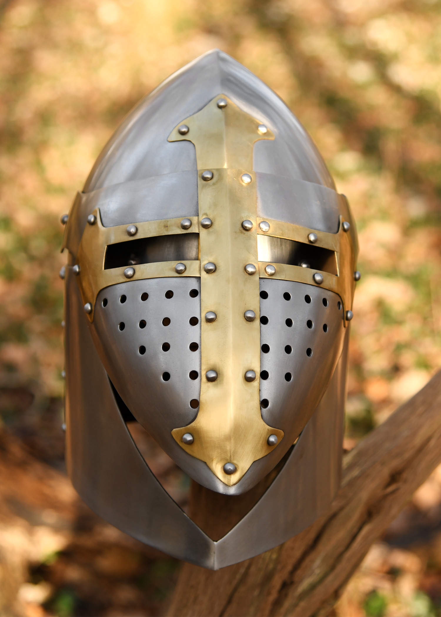 Grande elmo e chiamato anche Elmo Crociato, elmo da combattimento a protezione della testa dei cavalieri durante le crociate nel XII° ...