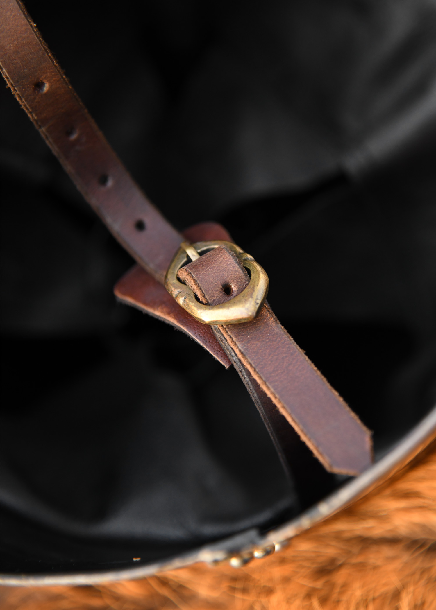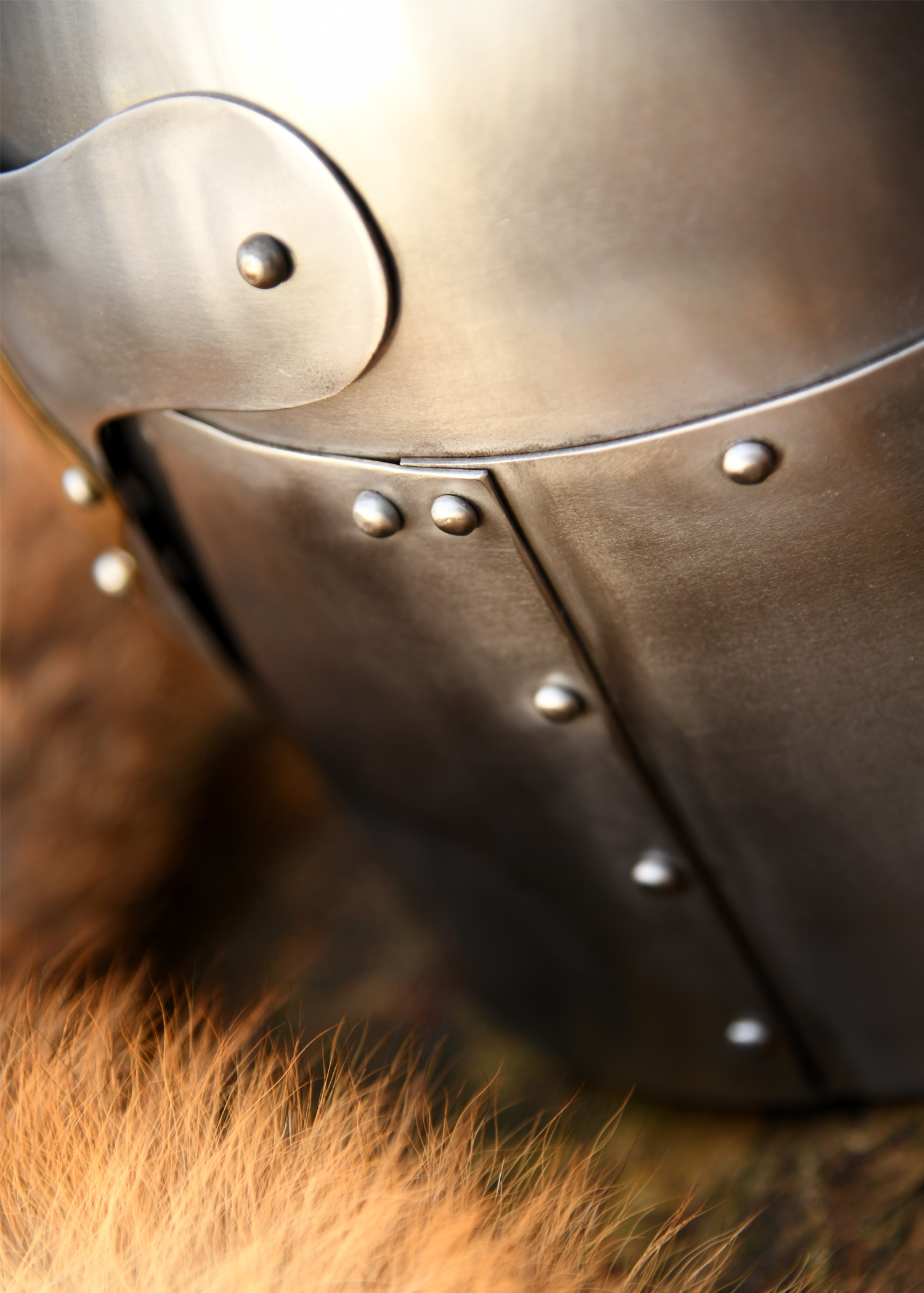 Grande elmo templare con croce in ottone e con visiera pieghevole, in acciaio da 1,6 mm, lucidato Nel Medioevo, gli elmi pentolari che si assottigliavano fino a raggiungere la campana erano chiamati anche elmi a pan di zucchero per la loro somiglianza con quest'ultimo. Questa forma di elmo spospolò all'inizio del XIV secolo. La nostra replica ha la particolarità della visiera è pieghevole. L'elmo è realizzato artigianalmente in acciaio spesso 1,6 mm. Ha una comoda cuffia in pelle regolabile in altezza e un sottogola. Questo elmo è disponibile sia con finitura anticata lucida che annerita (articolo n. 1716413504). Dettagli: