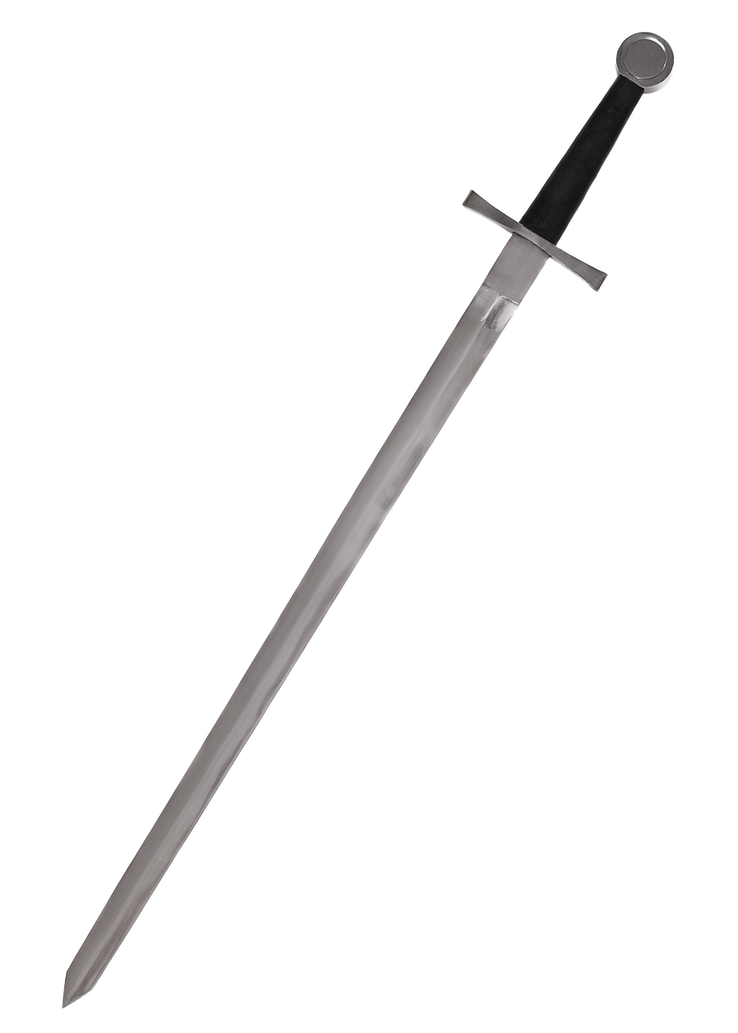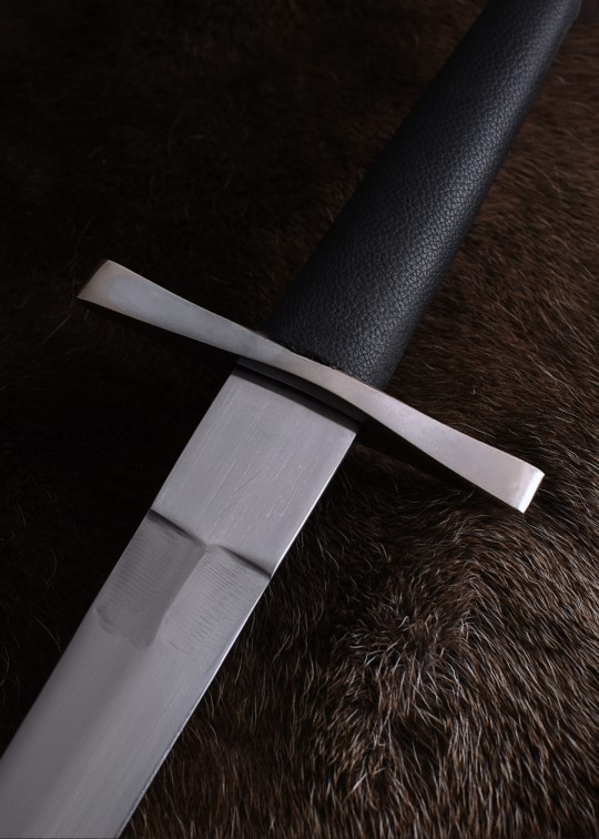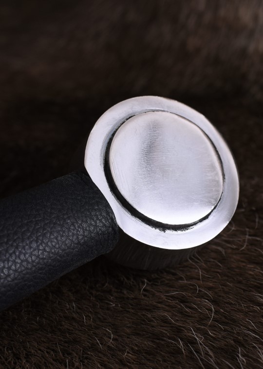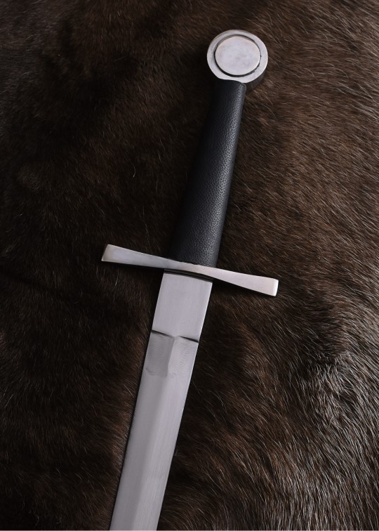 La lama in acciaio al carbonio della bellissima spada qui offerta è forgiata fino al pomo e doppiamente avvitata all'estremità del manico. Il manico ha un rivestimento in pelle cucito ed è dotato di un classico pomello a disco. La nostra spada medievale a una mano è caratterizzata dalla croce dritta, che conferisce alla spada la tipica forma a croce. La lama non è affilata.