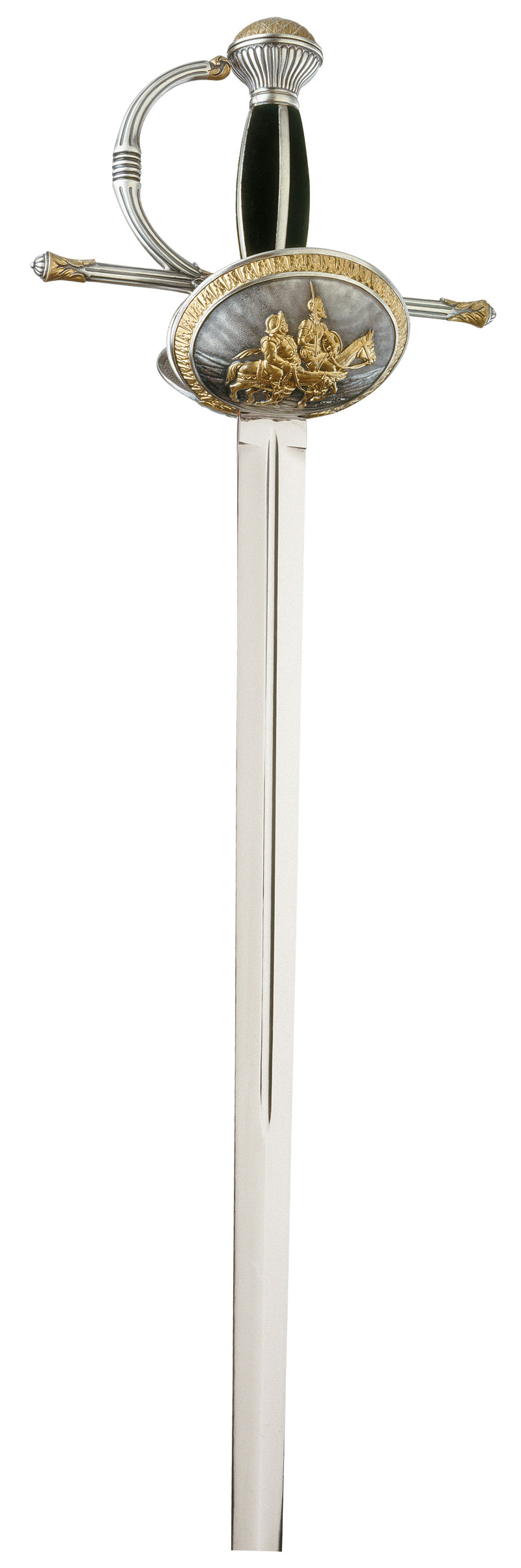 Spada a doppia valva di Don Alonso de Quijano, più conosciuto come Don Chisciotte della Mancia, cavaliere errante, con un gran senso del dovere e dell'onore che oltrepassa i confini della realtà, rasentando la pazzia. Cervantes racconta che Don Chisciotte attaccò i mulini a vento credendoli giganti, un gregge di pecore credendo fosse un'armata nemica, scambiò degli otri per fantasmi, etc. Da queste e altre avventure deriva la sua fama, tanto nella Mancha come in tutto il resto del mondo. Dettagli: Lunghezza: 102 cm Lunghezza totale 117 cm. Disponibilità: 7-8 giorni. Spada di alta qualità esclusiva collezione di spade storiche della Marto.
