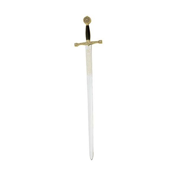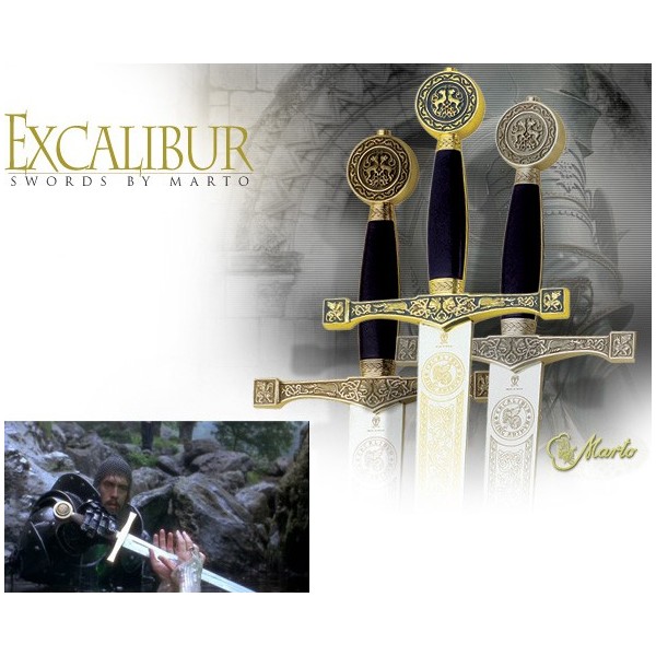| La storia e la leggenda di Re Artù sono intimamente legate alla magica e misteriosa spada Excalibur. Come aveva annunciato il Mago Merlino, solo chi fosse riuscito a estrarre la spada dalla roccia sarebbe diventato re. Artù riuscì in questa impresa. La lama della Spada Excalibur è in acciaio, decorata fino al primo terzo, il fornimento è in metallo fuso placcato in oro con dettagli decorativi a rilievo. Tirata fuori dalla pietra o donata dalla Signora del Lago, a seconda delle diverse versioni della leggenda, la vita di Re Artù di Britannia è comunque strettamente legata alla magica e misteriosa spada Excalibur. Dettagli: Lunghezza: 120 cm - 48 pollici. Lunghezza lama: 36 pollici di 1/2. Larghezza lama: 5/32 pollici. Lama: AISI 440 temperato Acciaio inox - 24K incise -Double taglio. Guardia / Pommel: Zama - 24K placcato oro. L'impugnatura è rivestita di pelle nera. Spada di alta qualità esclusiva collezione di spade storiche della Marto.