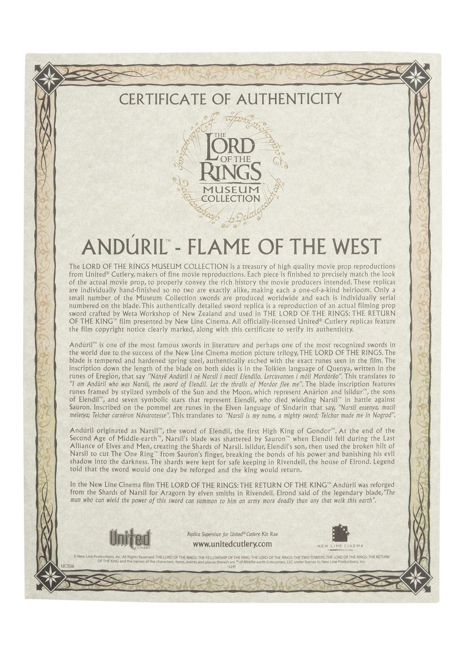 In Il Signore degli Anelli: Il ritorno del re, Anduril fu riforgiata dai fabbri elfici di Gran Burrone dai frammenti di Narsil per Aragorn. Elrond gli consegnò la spada con queste parole: «L'uomo che potrà brandire il potere di questa spada potrà radunare un esercito più letale di qualsiasi altro che abbia mai calpestato la terra».Questo autentico oggetto da collezione, fedele nei minimi dettagli, è una replica con licenza ufficiale del proprio originale utilizzato nella trilogia de Il Signore degli Anelli. United Cutlery, leader nel settore della riproduzione di oggetti utilizzati nei film, ha ricreato la spada originale con estrema precisione e utilizzando i materiali migliori e di più alta qualità. La priorità assoluta è stata data alla riproduzione fedele di tutti i dettagli. La Museum Collection Edition di Anduril ha una lama in acciaio al carbonio 1060 con diversi miglioramenti rispetto alla versione standard, per riprodurre ancora più fedelmente l'oggetto originale. La superficie è più lucida, le rune incise sulla lama sono più precise e la gola ha ora la lunghezza corretta.