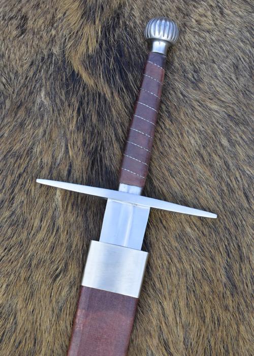 Riproduzione di una spada lunga tarda medievale, forgiata da mani. Guardia e il pomo sono fatti di ferro. Dettagli: - Materiale lama: acciaio EN45 - Lunghezza totale: 116,5 cm. - Lunghezza lama: ca. 92 cm. - Larghezza della lama alla guardia: 57 mm circa. - Punto di equilibrio: 15 cm. - Fodero in legno rivestito in pelle. - Peso (solo spada): 1700 gr.