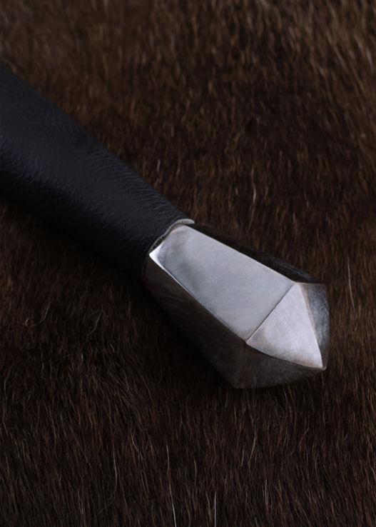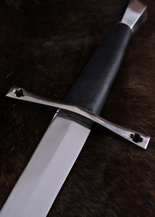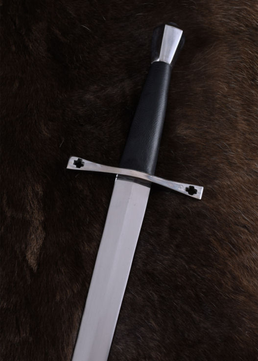 La lama in acciaio al carbonio di questa bellissima spada è forgiata fino al pomo e doppiamente imbullonata all'estremità del manico. Il manico ha un rivestimento in pelle cucita. La nostra spada medievale a una mano è caratterizzata dalla croce dritta, che conferisce alla spada la tipica forma a croce. La croce come simbolo si riflette anche nella nostra spada nell'incavo a forma di croce su entrambe le estremità della guardia. La lama non è affilata.